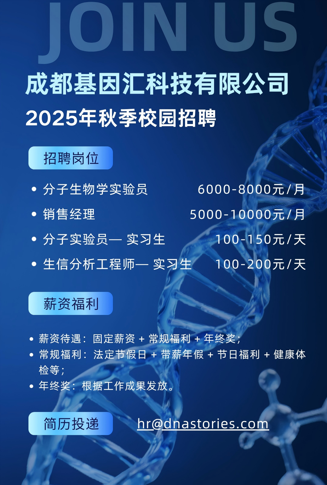 专业背景:生物科学、生物技术、分子生物学、遗传学、医学等相关专业;热爱销售工作,有强烈的成就导向和出色的沟通、谈判技巧,能够与客户建立稳定信任的合作关系具备出色的市场分析能力和客户需求洞察力,能准确把握市场机会。能接受必要的出差安排。