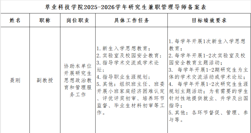 为进一步做好研究生思想政治教育与管理工作,根据《硕士研究生管理办法》(校研发〔2022〕25号)文件精神,学校为我院设置兼职管理导师1名(按学年度聘期进行管理),协助学院开展研究生思想政治教育和管理服务工作。经学院研究,决定年级班主任按学年度轮流担任兼职管理导师,聘任聂刚副教授为2025-2026学年度兼职管理导师。现予以公示: