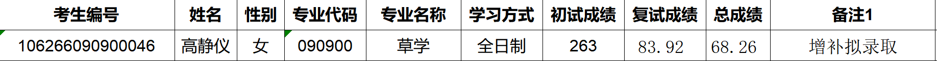 草业科技学院2026年硕士研究生招生拟录取增补名单公示