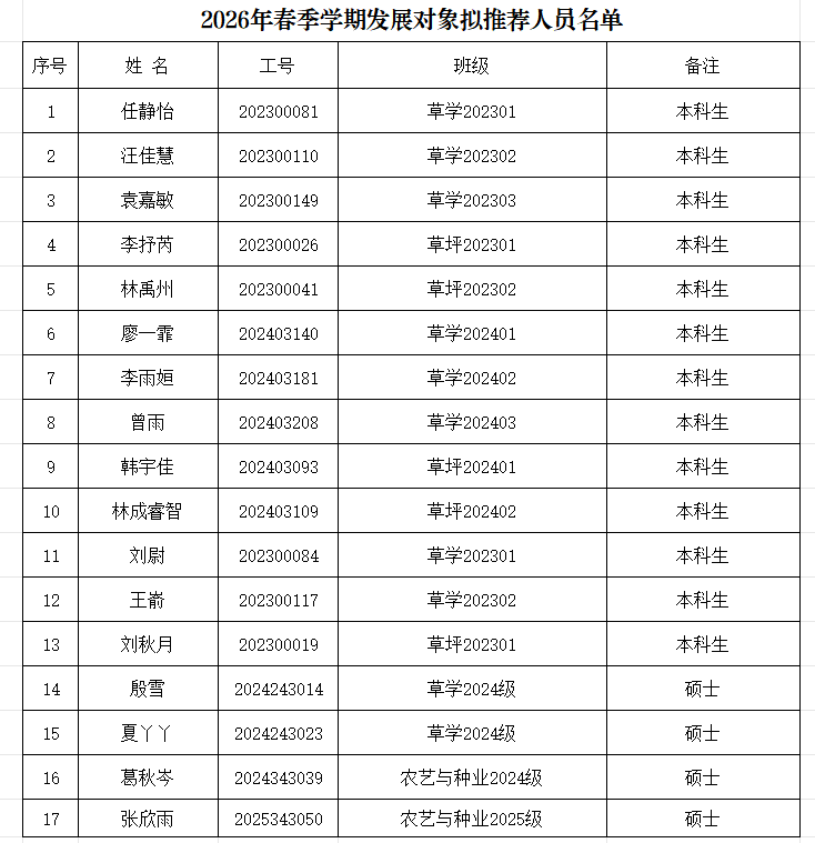 经党团支部、党团学组织推荐,在听取培养联系人、党员和群众意见的基础上,经支部大会讨论,学院党委审查通过,拟发展任静怡等17名同志为发展对象(名单见附件)。现将其有关情况公示如下:
