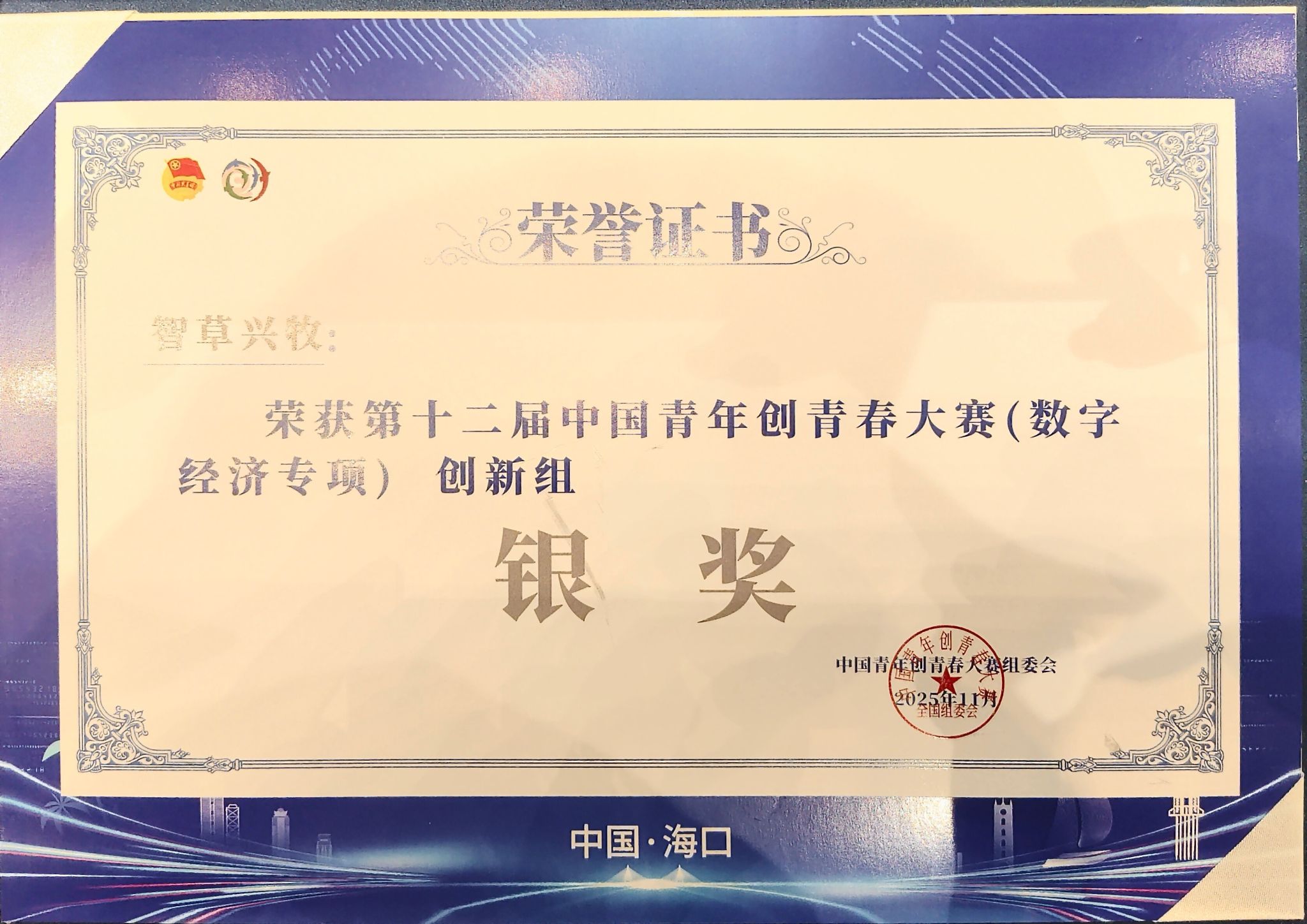 据悉,本届“创青春”大赛聚焦科技创新、乡村振兴、数字经济与社会服务等领域,吸引全国众多青年创业项目参与角逐。最终“智草兴牧”项目凭借其显著的技术创新性、扎实的产业结合度,最终斩获国家级银奖,展现了我院学子立足专业、服务三农的创新能力与责任担当。